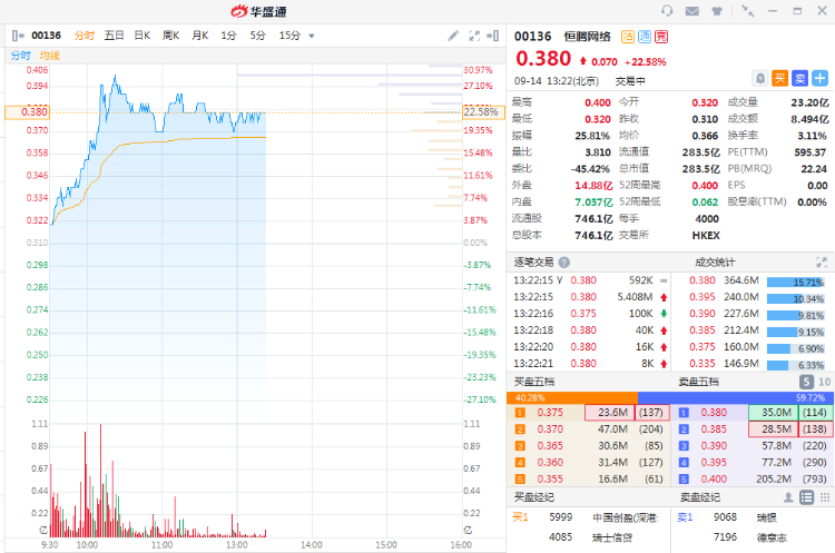 9月14日消息,恒腾网络涨22.58%,现报0.38港元,最新市值283.5亿港元。