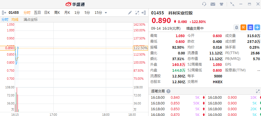 华盛资讯9月14日,科利实业(01455.HK)暗盘高开,截至16:16涨122.5%,报价0.89港元,成交额2570万港元,最新市值11.12亿港元。