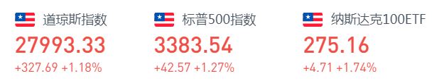 周一道指涨327.69点,或1.18%,报27993.33点;纳指涨203.11点,或1.87%,报11056.65点;标普500指数涨42.57点,或1.27%,报3383.54点。