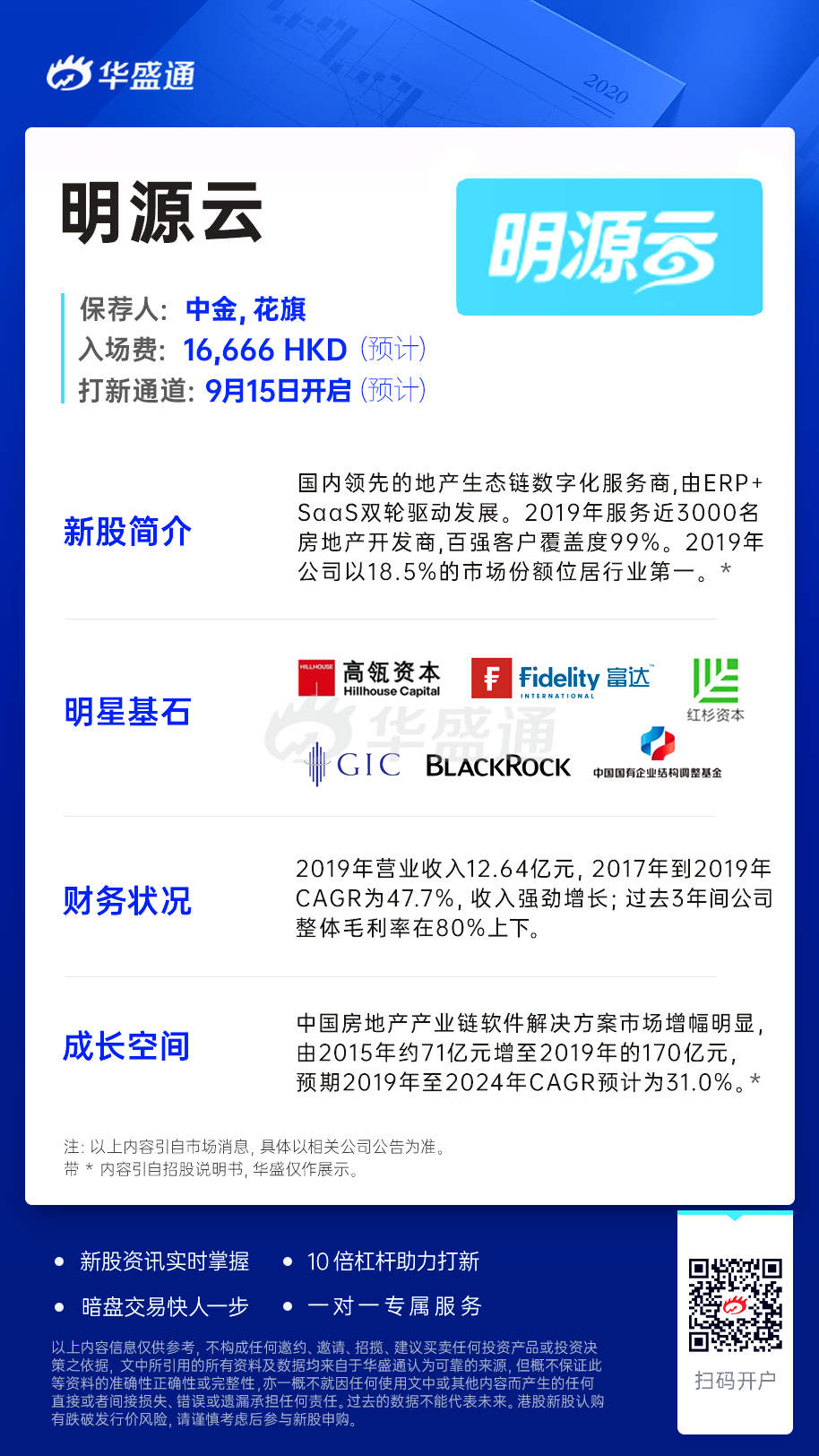 明源云(00909)于2020年9月15日-9月18日招股,该公司拟发行3.74亿股,其中,香港发售占10%,国际发售占90%,另有15%超额配股权。每股发售价15.00-16.50港元,每手1000股,入场费16666.28港元,预期公司股份将于2020年9月25日上市。