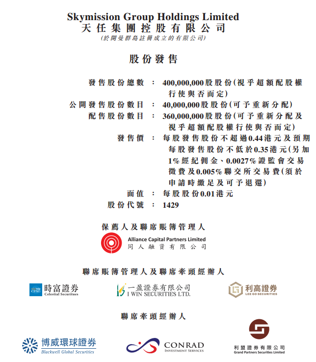 华盛资讯消息,天任集团(01429)于2020年9月15日-9月18日招股,公司拟发行4亿股股份,其中,公开发售占10%,国际配售占90%,另有15%超额配股权。每股发售价0.35-0.44港元,每手8000股,入场费3555.48港元,预期将于2020年9月29日上市,保荐人同人融资。本公司预期向配售包销商授出超额配股权,比例为15%。