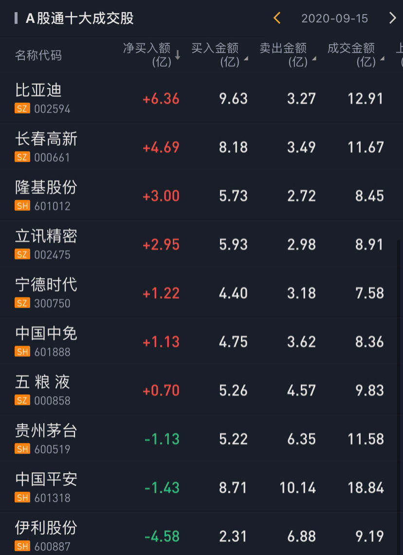 北上资金今日净买入比亚迪6.36亿元,净买入长春高新4.69亿元,净买入隆基股份3亿元。