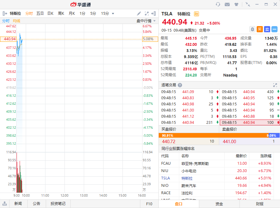 华盛资讯9月15日消息,特斯拉股价直线拉升,截至发稿涨5.08%,报440.94美元。
