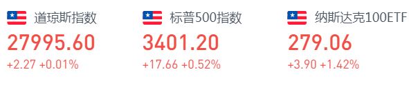周二道指涨2.27点,或0.01%,报27995.60点;纳指涨133.67点,或1.21%,报11190.32点;标普500指数涨17.66点,或0.52%,报3401.20点。