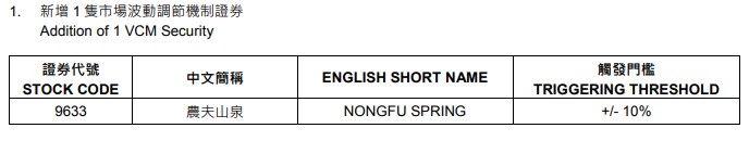 港交所:新增农夫山泉为市场波动调节机制证券