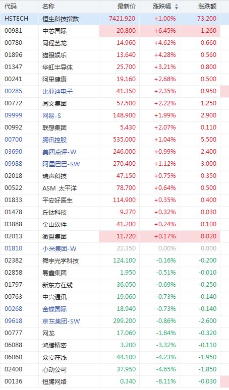 恒生科技指数目前涨1%,成分股中芯片股走强,中芯国际涨超6%领涨,华虹半导体涨超3%。