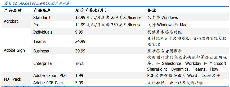 Adobe 目前主要 3 块产品板块,分别是主打设计软件生态的创意云(Creative Cloud,简称“CC”)、聚焦文件管理和数字签名的文档云(Document Cloud,简称“DC”)以及数字营销板块的体验云(Experience Cloud,简称“EC”)。从 Adobe 的发展转型历程来看,它经历了三步 SaaS 转型,从自己产品系列最为丰富强大的数字创意板块、到全球知名的 PDF 文档办公产品再到之前相对偏 B 端的数字营销板块。