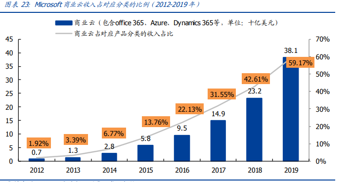 体现到财务数据层面,公司的商业云(包含 office 365、Azure、Dynamics 365 等)带来的收入从 2014 年的 28 亿美元大幅提升至 2019 年的 381 亿美元,营收占 Office/Serverproduct and cloud services 收入的比例从 2014 年的 6.77%提升至 2018 年的 59.17%。Office 365 的个人消费者用户数也出现了快速的增长,从 2014 年的超过 500 万个大幅增加到 2019 年的 3,480 万个。