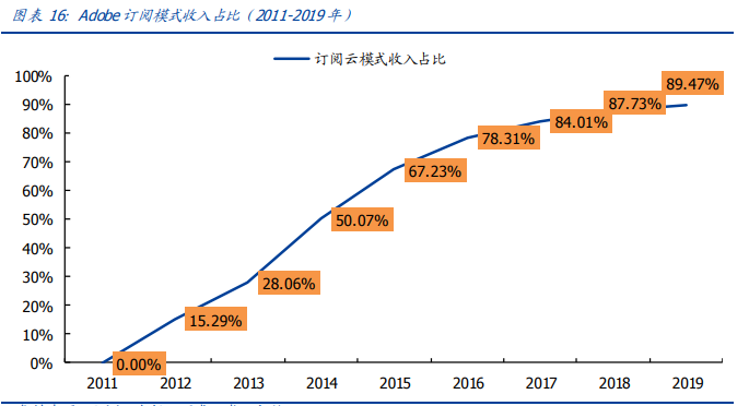 财务数据持续验证转型成果。Adobe 的订阅收入占整体收入的比重逐年快速上升,2019年高达 89.47%,数字媒体 ARR(为 CC 和 DC 业务的 ARR 之和)收入也呈现出逐年快速上升的态势,2018 年达到 84.00 亿美元,经营性净现金流和递延收入均呈现非常健康的发展态势,Adobe 的云转型之路基本成功。