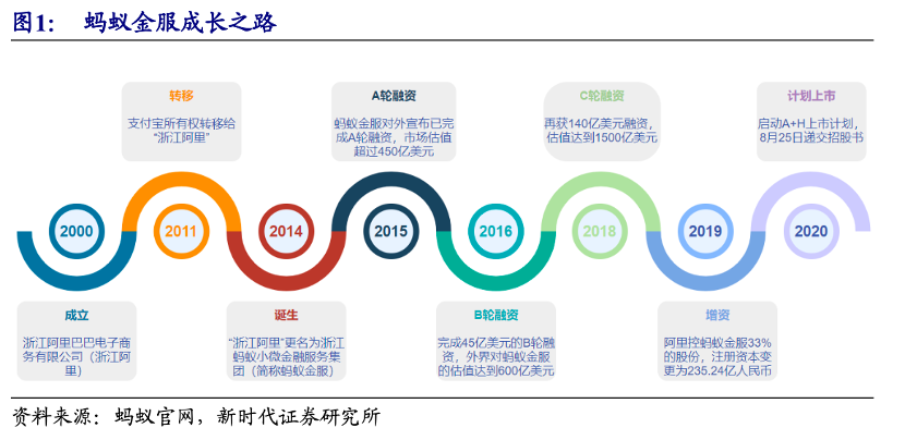 从这个角度看,蚂蚁集团必然成为万众瞩目的打新热股。本文将结合兴业证券研究报告《支付宝是如何炼成蚂蚁金服的》、新时代证券研报《蚂蚁金服:见证蚂蚁成为大象之路》,为投资者分析蚂蚁金服历史、业务、及估值。