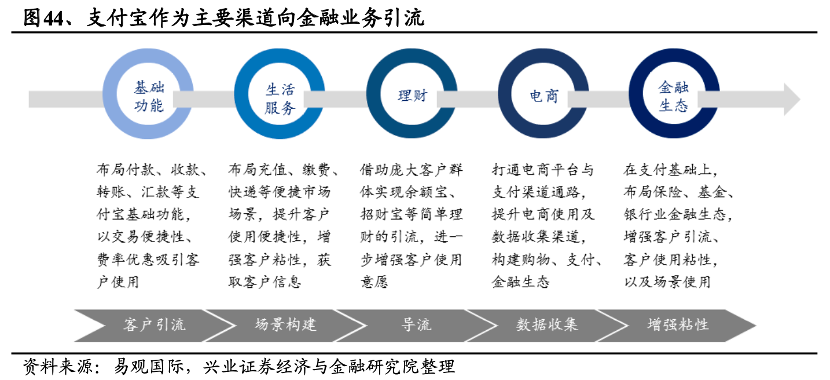 支付宝作为主要渠道,以便捷的支付服务和多元的支付场景深度绑定客户,通过庞大的用户群体引流,对接生活服务、理财、电商、金融等功能接口。