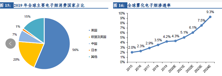 从更长期的视角看,雾化电子烟的空间非常广阔。截至2019年,全球烟草市场规模已达到8654亿美元(约合人民币6万亿元),雾化电子烟的渗透率仅有4.2%。即使在25%的复合增速下,到2024年雾化电子烟的渗透率也仅有9.3%,具有长期快速发展的空间。