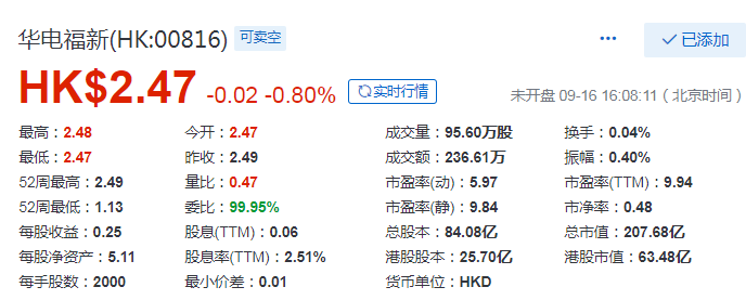 华电福新,来自福建,于2012年6月28日在港交所挂牌上市。截至昨日(9月16日) ,其总市值为207.68亿港元。