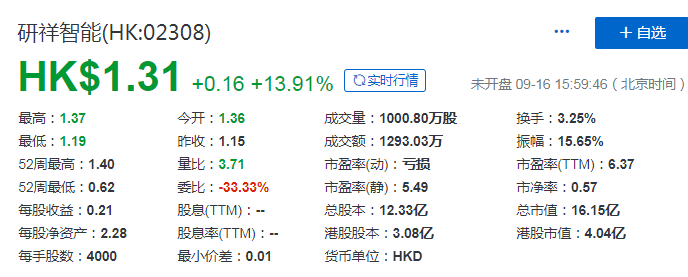 研祥智能,来自深圳,于2003年10月10日在港交所挂牌上市。截至昨日(9月16日) ,其总市值为16.15亿港元。
