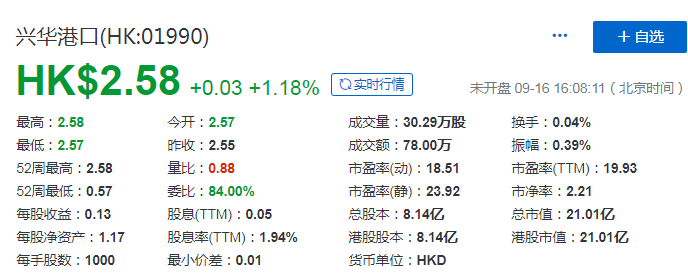 兴华港口,来自江苏常熟,于2018年2月12日在港交所挂牌上市。截至昨日(9月16日) ,,其总市值为21.01亿港元。