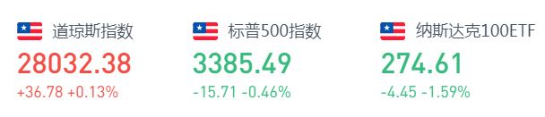 截至收盘,道琼斯指数涨36.78点,涨幅0.13%,报28032.38点;标普500指数跌14.64点,跌幅0.43%,报3386.56点;纳斯达克综合指数跌139.85点,跌幅1.25%,报11050.47点。