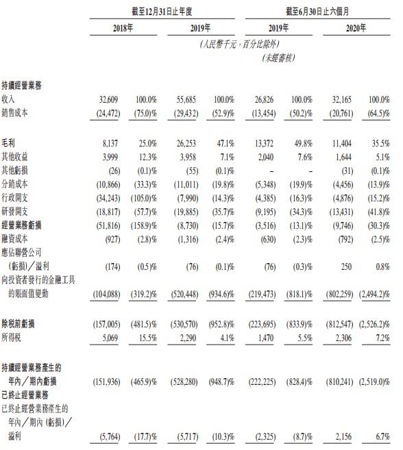 2018年-2019年的年度净亏损分别为576.4万元和571.7万元。2019年上半年净亏损为232.5万元,2020年上半年净利润为215.6万元。