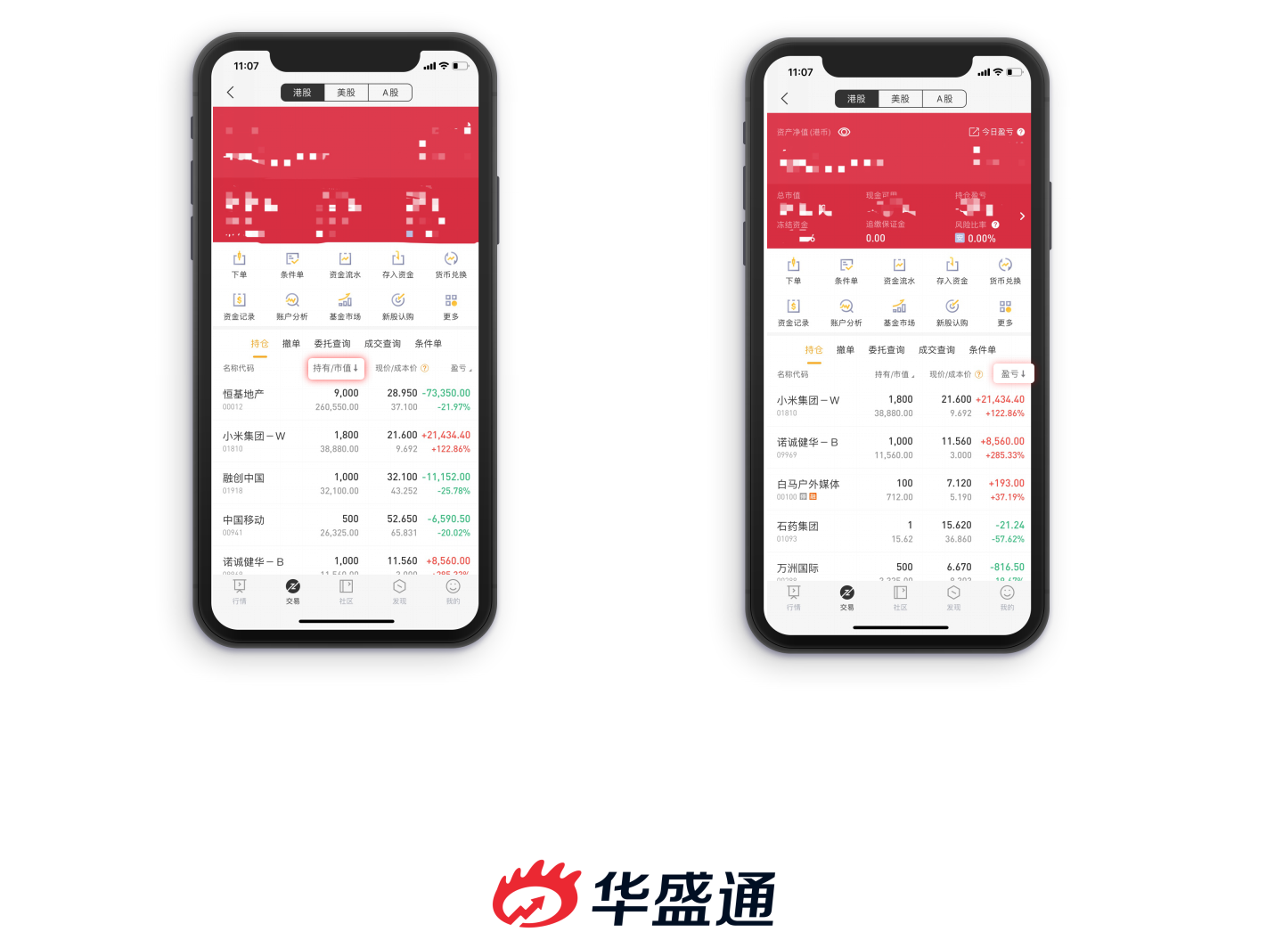 在【华盛通2.3.1】新版中新增了股票持仓排序,现在您可以通过点击栏目中的【持有/市值】、【盈亏】对股票持仓进行升序、降序排序。