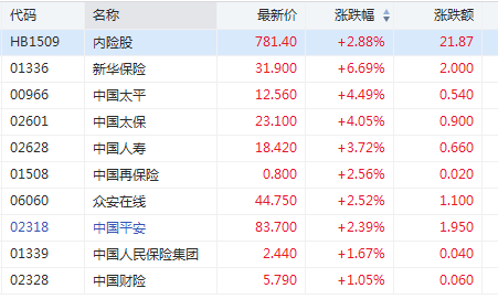 9月18日消息,港股内险股涨幅扩大,新华保险涨6.69%,中国太平涨4.49%,中国太保涨4.05%,中国人寿涨3.72%。