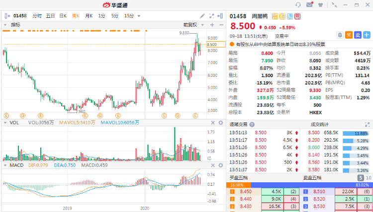 格隆汇9月18日丨周黑鸭(1458.HK)今日平开高走,午后涨幅扩大,现报8.5港元,涨5.59%,暂成交4619万港元,最新总市值202亿港元。