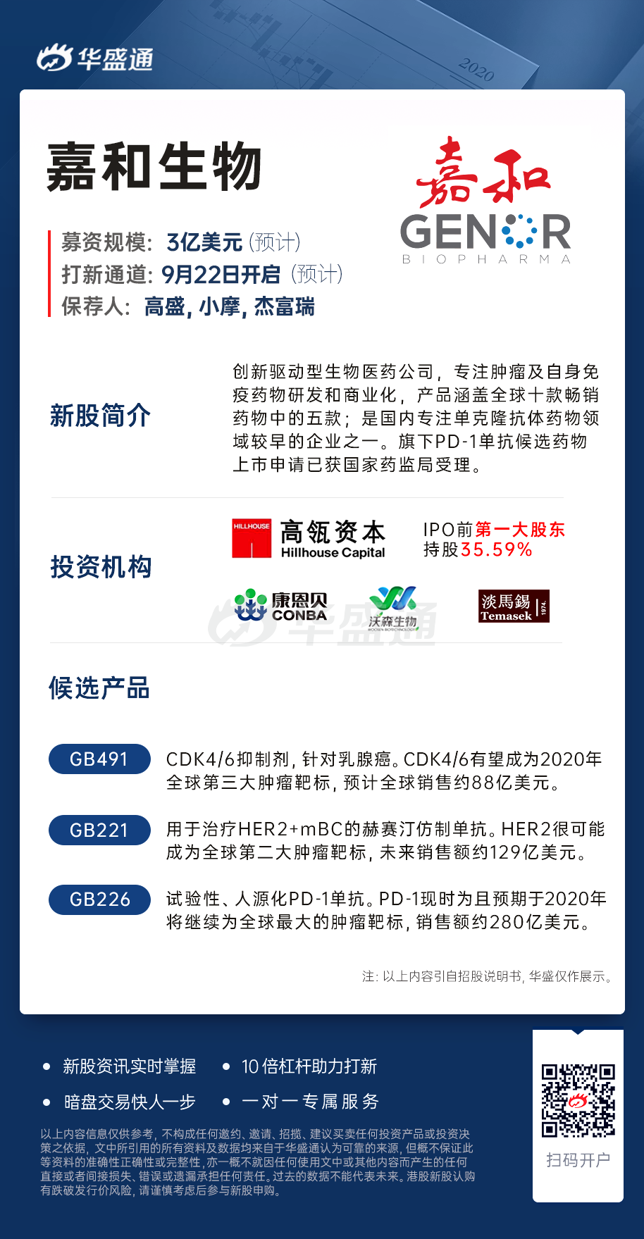据路透社旗下媒体IFR援引消息人士称,由高瓴资本继续加码成为第一大基石的生物制药企业嘉和生物将于下周招股,计划集资最多3亿美元(约23.4亿港元),每手1000股。每股价格17.3-18.5港币。