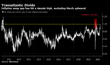 美联储计划将利率保持在接近零的水平直到至少2023年,国会正在努力制定新一轮财政刺激措施,一些债市投资者预计未来几年美国通胀率可能小幅超过2%。与此形成鲜明对比的是,对欧洲的通缩恐惧再度觉醒,日本几十年来与通缩的搏斗至今没有成功。