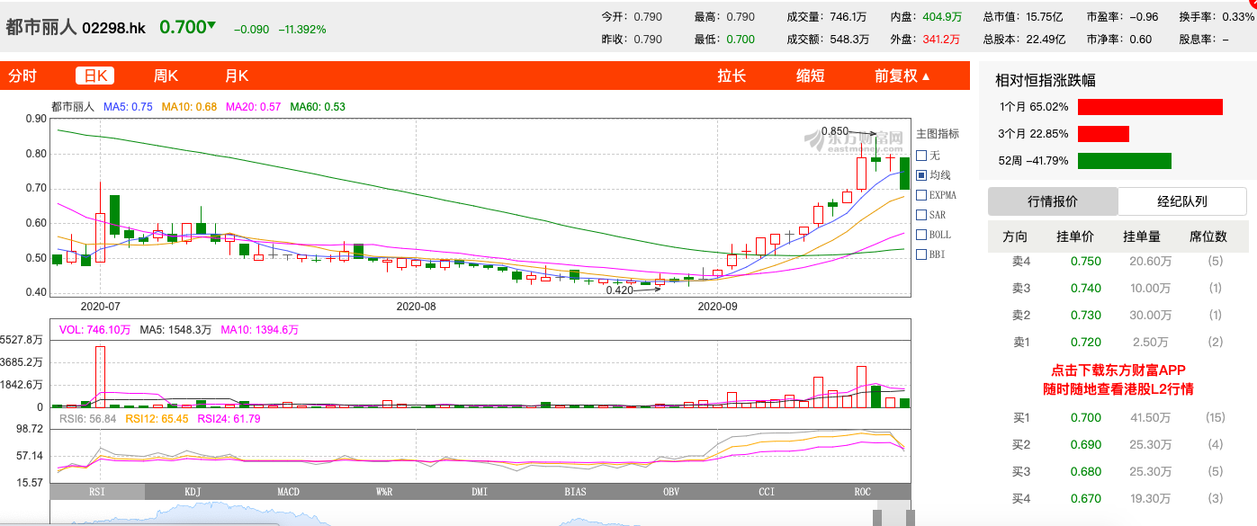 一般而言,增持股份是上市公司提振市场信心、增强投资者信念的重要手段之一。从都市丽人近期的股市表现来看,高管增持股份的效果已有所显现。新京报记者注意到,都市丽人在8月18日至8月31日的收盘价一直在0.42港元/股-0.44港元/股区间徘徊,其中8月25日报收0.42港元/股的股价,是都市丽人今年至今的最低股价。随着都市丽人高管不断增持股份,截至9月18日,都市丽人报收0.7港元/股,较8月25日股价涨幅已达66.7%;较高管开始增持股份的8月31日股价,涨幅为60%。