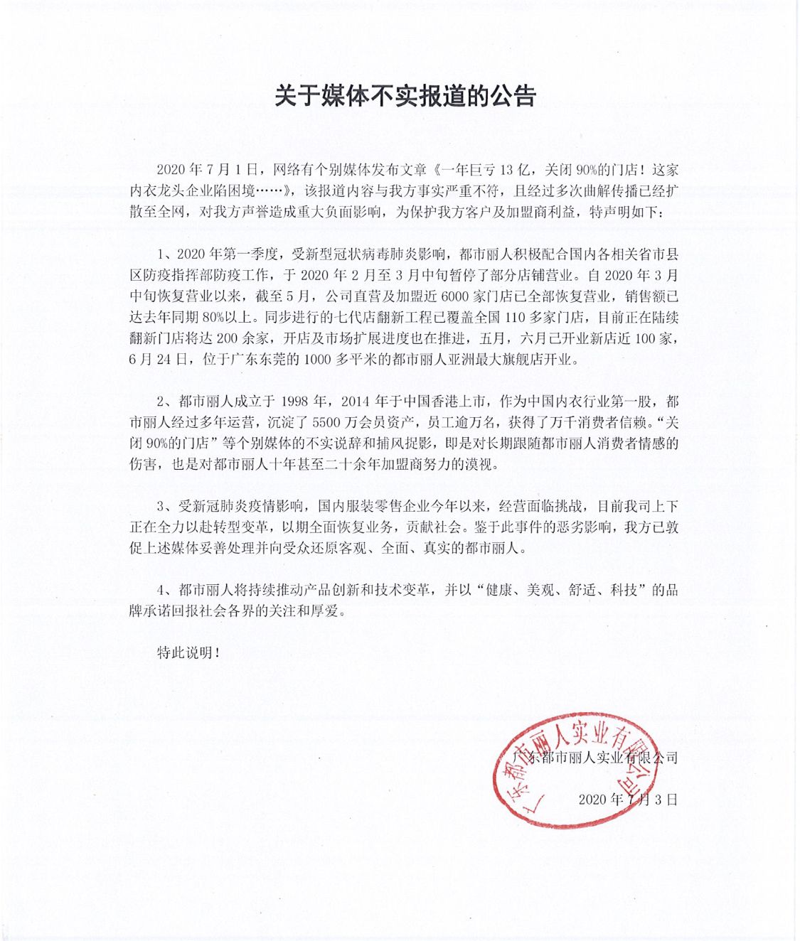 在维多利亚的秘密分公司陷入破产管理后不久,有着“中国版维密”之称的都市丽人在7月初被曝出将关闭90%门店的消息,甚至还登上了微博热搜。随后都市丽人官方对“关闭90%门店”的说法予以否认,表示只是在疫情期间暂停了部分店铺营业。截至5月,都市丽人直营及加盟近6000家门店已全部恢复营业。