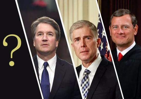 保守派剩下的法官(从右至左):约翰·罗伯茨、尼尔·戈萨奇、布雷特·卡瓦诺
