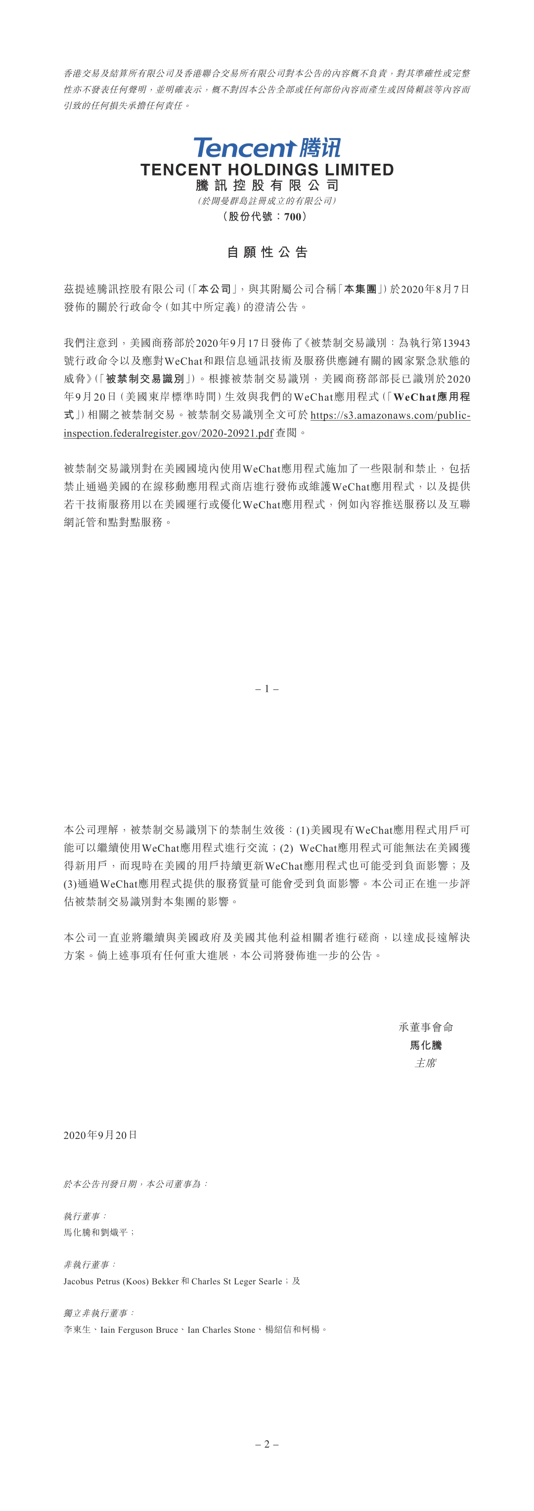 兹提述腾讯控股有限公司(“本公司”,与其附属公司合称“本集团”)于2020年8月7日发布的关于行政命令(如其中所定义)的澄清公告。