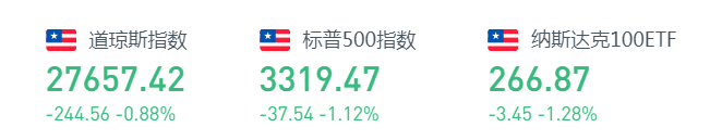周五,美股三大股指开盘涨跌互现;道指小幅低开,早盘一度转涨,后跌超1%。截至收盘,道琼斯指数跌244.56点,跌幅0.88%,报27657.42点;标普500指数跌39.58点,跌幅1.18%,报3317.43点;纳斯达克综合指数跌117.00点,跌幅1.07%,报10793.28点。