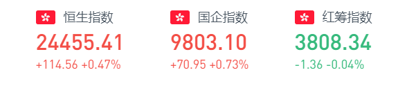 上周五恒指早盘高开40.28点或0.17%,报24381.13点。截至收盘,恒生指数涨114.56点或0.47%,报24455.41点,全日成交额达1440.88亿。国企指数涨0.73%,报9803.1点,红筹指数跌0.04%,报3808.34点。