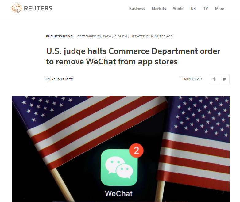 美媒:美国法官判决暂阻WeChat禁令
