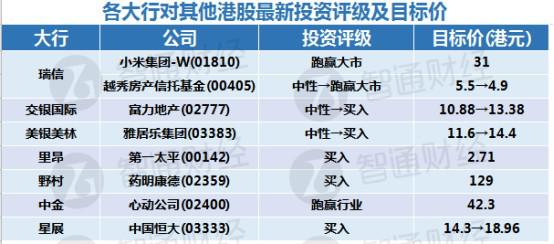 四、各大行对其他港股最新投资评级及目标价
