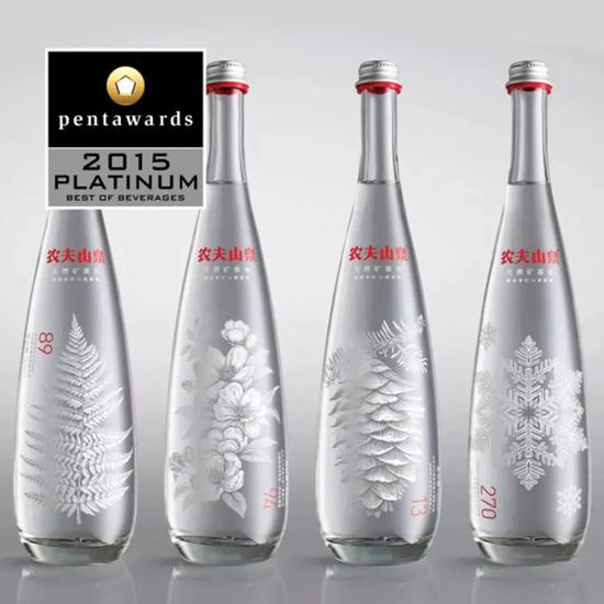 随着近两年消费者对品质生活的要求,以及斐泉、蓝湾等高端水的走红,农夫山泉也推出高端水系列,在设计上做足功夫,并获得设计界的Pentawards铂金奖。