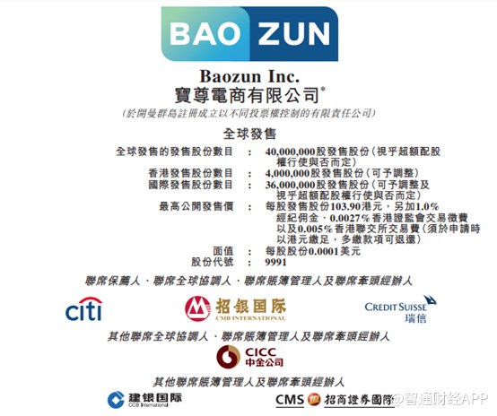最新公告显示,宝尊于2020年9月18日-23日招股,公司拟全球发售4000万股,其中香港公开发售占10%,国际发售占90%,另有15%超额配股权。公开发售价将不超过每股香港发售股份103.90港元,每手100股,预期A类普通股将于2020年9月29日(星期二)上午九时正开始买卖。