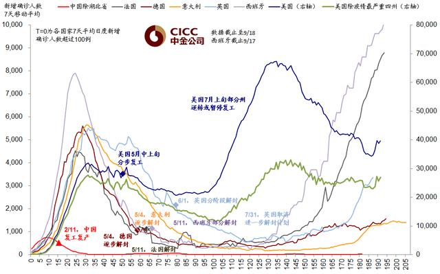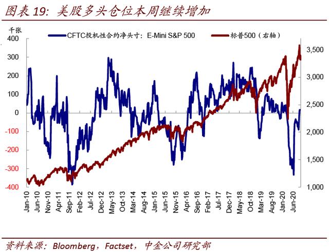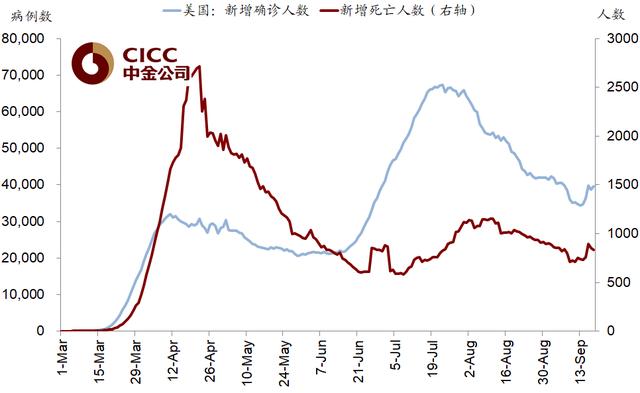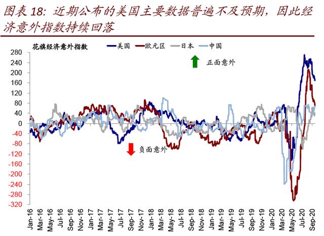 此外,上周也出现一些不太积极的变化,值得关注:1)随着大选临近,政策和政治不确定性因素可能增多,例如美国商务部决定9月20日开始禁止抖音和微信在美国的部分功能和交易等;2)上周公布的美国主要经济数据如零售消费、新屋开工、工业产出等均不及预期,使得经济意外指数下滑;3)美国疫情新增和死亡病例都略有增多。