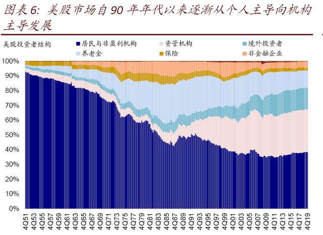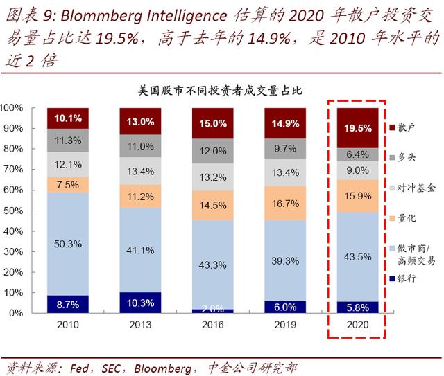 这一水平相比历史正常水平也有明显攀升。由于上文中提到的SEC数据仅从2020年开始,因此无法与较长的历史周期作对比,因此我们选择美股三大散户交易平台的日均交易收益(DARTs)作为参考,这一水平从2019年四季度末的约150万美元跃升至二季度的约600万美元。此外,Bloomberg Intelligence的估算也是如此。相比做市商、对冲基金等机构投资者,美股个人投资者2010年以来一直处于10~15%的区间,但2020年以来这一比例激增至19.5%。