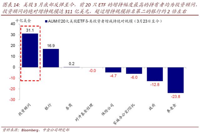 通过观察AUM前20大的美股ETF在3月23日至今的投资者持仓情况,我们发现,前20只美股ETF 3月底市场反弹以来增持规模最多的均为投资顾问(Investment Advisor,即相对更多面向高净值个人客户的理财和投资顾问),明显领先其他类型投资者;其绝对增持规模达311亿美元,达到排名第二的银行客户近2倍左右。
