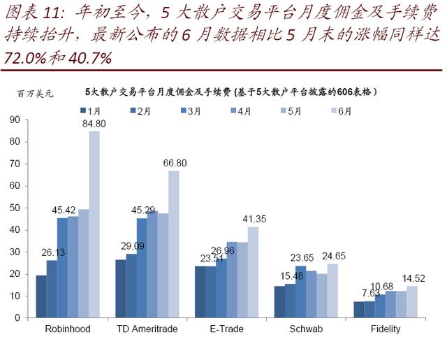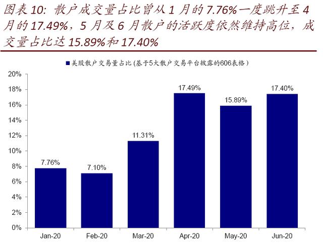 i. 疫情以来,美国五大交易平台佣金费用持续增加,二季度散户活跃度维持高位,成交贡献约为16~17%。SEC在2019年末要求经纪交易商按季度公开披露其个人投资者及机构投资者的相关交易信息(月度数据)[1],我们选取了美股5大零售交易平台Robinhood、E-trade、TDAmeritrade、Charles Schwab、以及Fidelity,并分别统计了各机构月度交易订单产生的佣金及手续费(Net payment received)和每股净收入(Netpayment received per share),进而可以计算出其隐含的成交量。年初至今,5大散户交易平台月度佣金及手续费持续抬升,Robinhood和TDAmeritrade 3月末佣金及手续费较2月末的环比增速达73.9%和55.7%,而最新公布的6月末数据相比5月末的涨幅同样达72.0%和40.7%。进一步看,如若将5大零售交易平台月度隐含成交量与美股市场整体成交量对比,可以得出散户成交量占比从1月的7.76%跳升至4月的17.5%,5~6月也依然维持高位,成交占比达15.9%和17.4%。这一水平和Bloomberg Intelligence估算的19.5%的比例也基本一致。