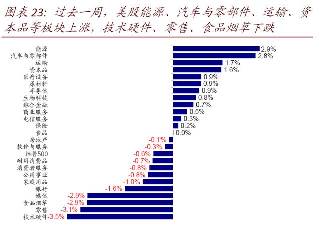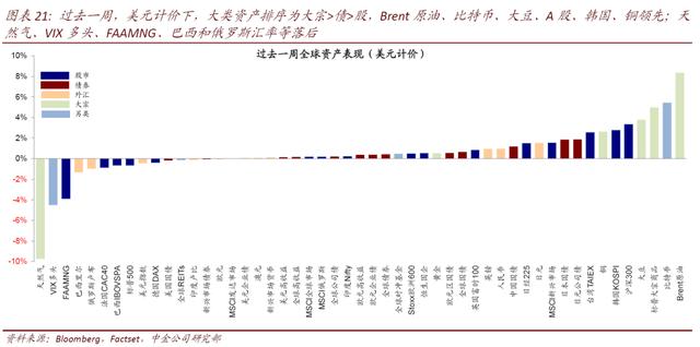 ► 资产表现:价值继续领先,美元小幅走弱。美元计价下,大类资产排序为大宗>债>股,Brent原油、比特币、大豆、A股、韩国、铜领先;天然气、VIX多头、FAAMNG、巴西和俄罗斯汇率等落后。美股市场依然以价值板块领先,而技术硬件、零售、食品烟草等下跌。美国10年期国债利率和实际利率均有所抬升,信用利差收窄。