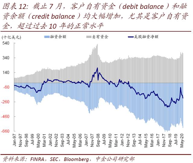 iii. 自有资金和融资余额均大幅增加。FIRNA统计的券商融资业务数据显示,截止7月,客户自有资金(credit balance)和融资余额(debit balance)均大幅增加,尤其是客户自有资金(超过4000亿美元),明显超出2008年以来过去10年的正常水平(3500亿美元左右)。由于直接的融资通常被认为更多涉及个人交易账户,因此这一规模的增加也可以侧面反映个人投资者入市的热情。