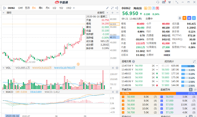 9月21日消息,海底捞午后大跌5.24%,市值3018亿港元。近期内资减持多于增持,最新内资持股3.33%。