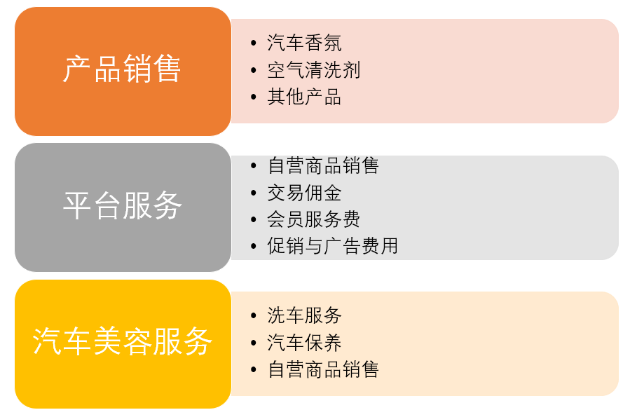 公司的业务主要包括三块:B2B电子商务平台,汽车产品和汽车美容服务。公司的B2B电商平台分为自营和第三方商家。自营商品即公司自主研发、生产的汽车用品的线上销售,此外,截至2020年4月公司的B2B电商平台还吸引了约3100个第三方商家,销售约21万种汽车产品。这部分则主要通过交易佣金、会员服务费、平台广告推广等方式获取收入。