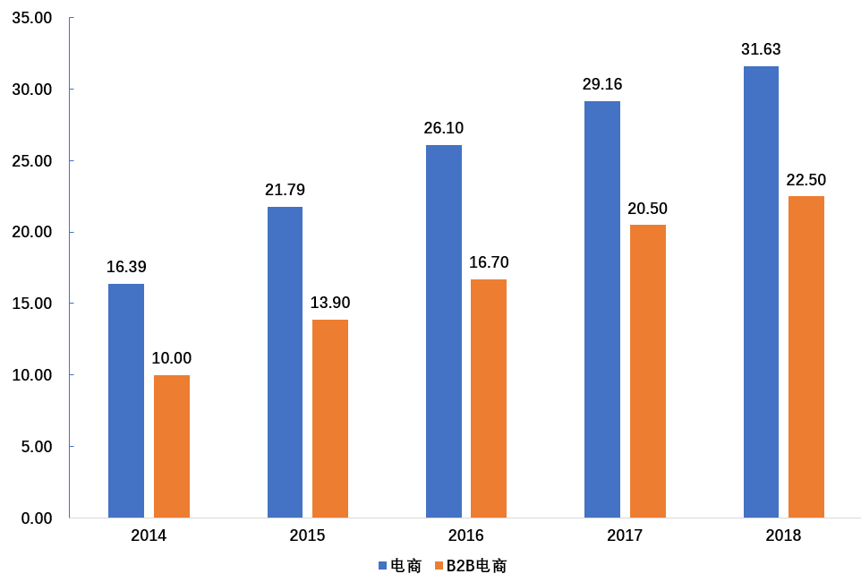 中国电商行业经历了早期的萌芽期和爆发期,如今进入了稳定发展时期。2018年,整体电商规模达到31.63万亿元人民币,其中B2B电商市场规模达22.50万亿元人民币,占当年电商市场总规模的71.1%。2014~2018年,电商和B2B电商的CAGR为17.9%和22.5%,B2B电商市场的增速明显高于行业整体增速。