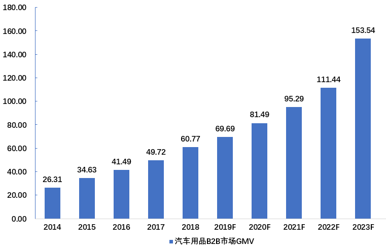 中国汽车用品B2B市场GMV(十亿人民币);来源:公司招股书