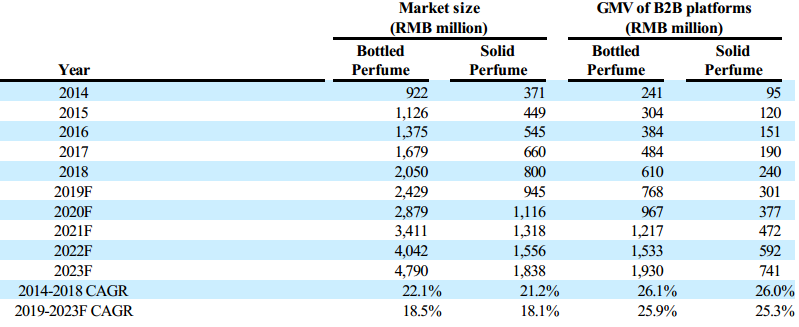 公司深耕的车用香氛领域,展现了比行业平均更高的景气度。2018年,车用瓶装香氛与固体香氛B2B GMV为6.1亿元和2.4亿元人民币,预计未来五年的CAGR为25.9%和25.3%。