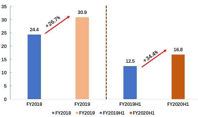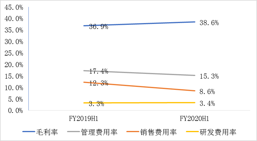 同时,公司费用率持续改善,FY2020H1管理费用率为15.3%,较上年同期下降2.1pct;FY2020H1销售费用率为8.6%,较上年同期下降3.7pct;研发费用率则为3.4%,与上年同期基本持平。