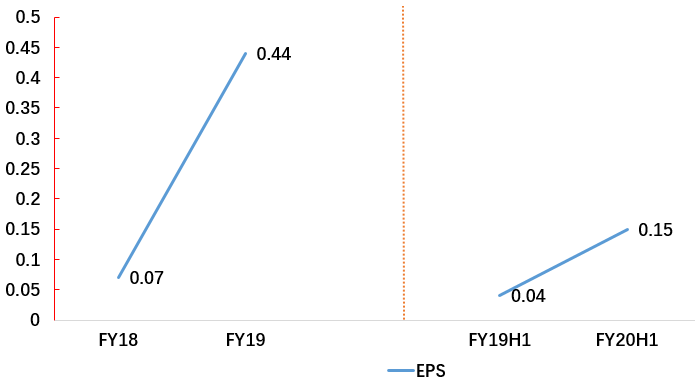 毛利率的提升与费用率的下降,使得公司的盈利能力不断增强。FY2018与FY2019公司EPS分别为0.07和0.44美元,增幅明显。FY2020H1公司EPS为0.15美元,同样较上年同期大幅增长。