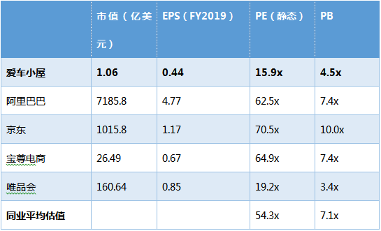 根据爱车小屋的招股信息,公司的招股价为6.5~7.5美元,合公开发售后市值区间为9815万~11325万美元。我们取平均数,则爱车小屋市值为1.06亿美元,对应15.9倍的静态估值。